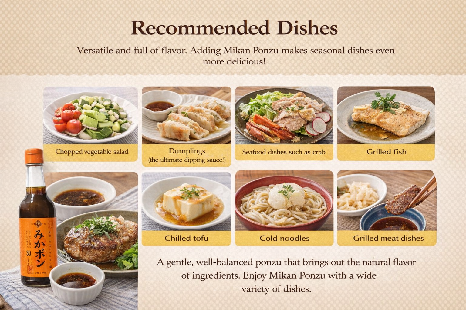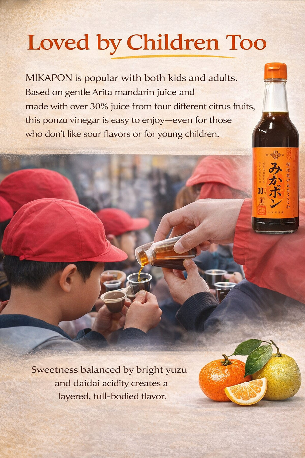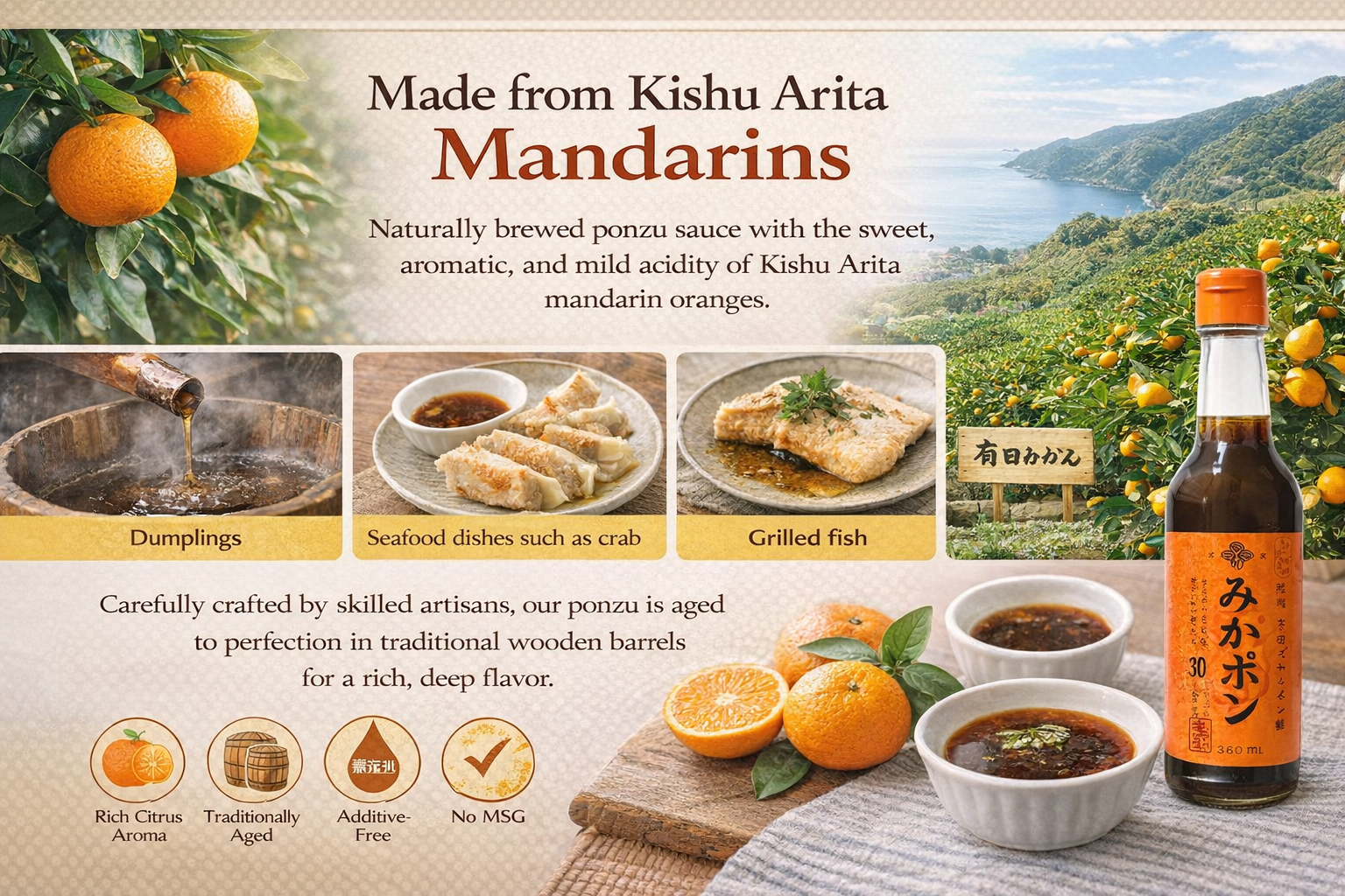 有田みかん果汁をベースに、ゆず、橙、黄金柑果汁の4種類をブレンド。合計なんと40%以上もストレート果汁を使用しており、まろやかな酸味が特徴です。ポン酢が苦手な人や、お子様にも大人気のポン酢です。様々旬の食材にご利用ください。■焼き肉、焼き魚、ぎょうざ、おろしハンバーグ、鍋物、冷しゃぶ、かつおのたたき、冷奴、オニオンライス等