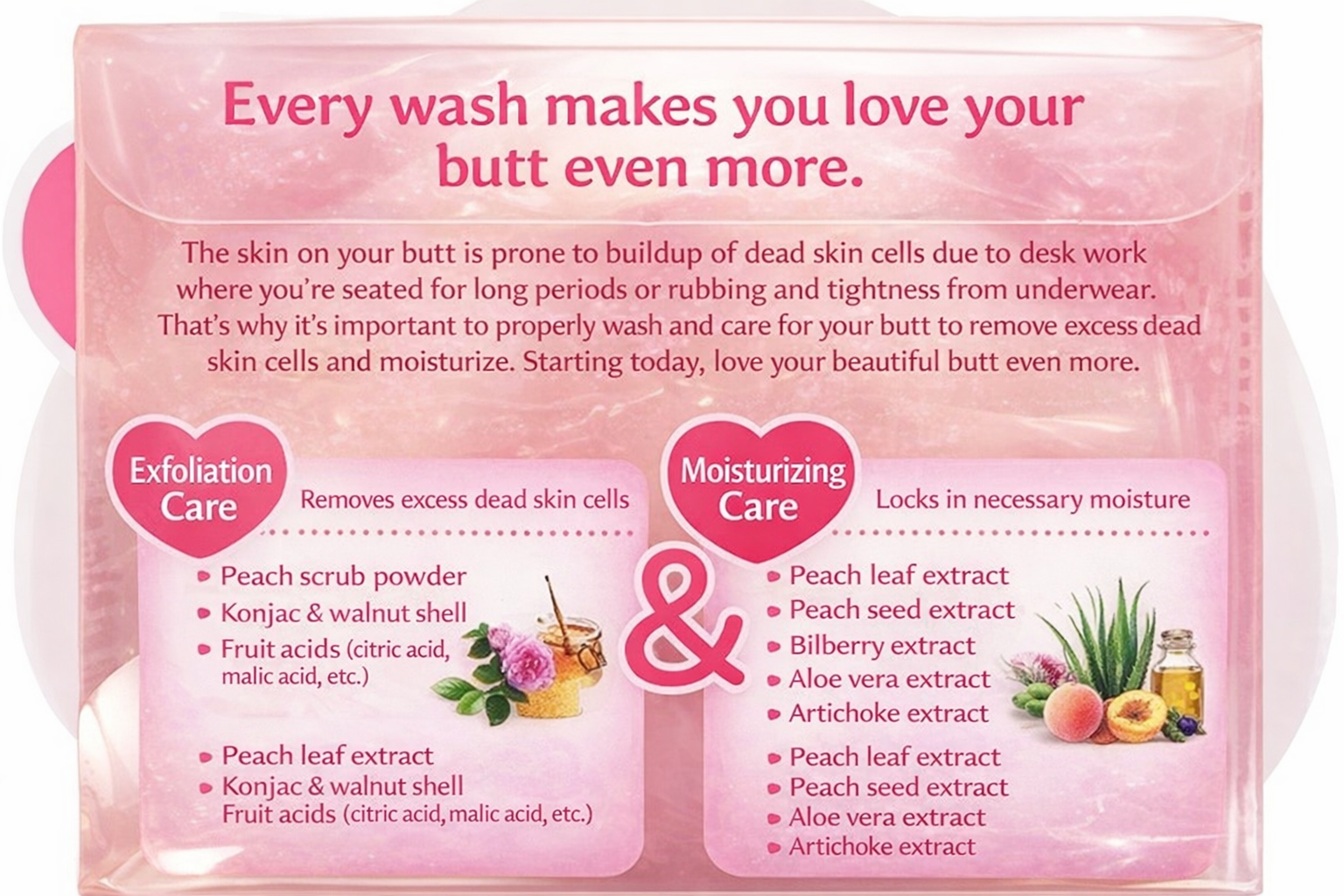 もぎたてピーチのやさしい香りで、毎日のバスタイムが楽しくなるヒップケアソープです。