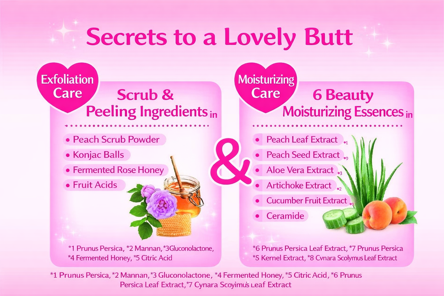 石ケン素地、水、モモ核、マンナン、グルコノバクター/ハチミツ発酵液、リンゴ酸、乳酸、クエン酸、モモ葉エキス、モモ種子エキス、ビワ葉エキス、キウイエキス、アーチチョーク葉エキス、アロエベラ液汁、グルコース、チャ葉エキス、グリセリン、塩化Na、BG、EDTA-4Na、エチドロン酸、エチドロン酸4Na、酸化鉄・香料